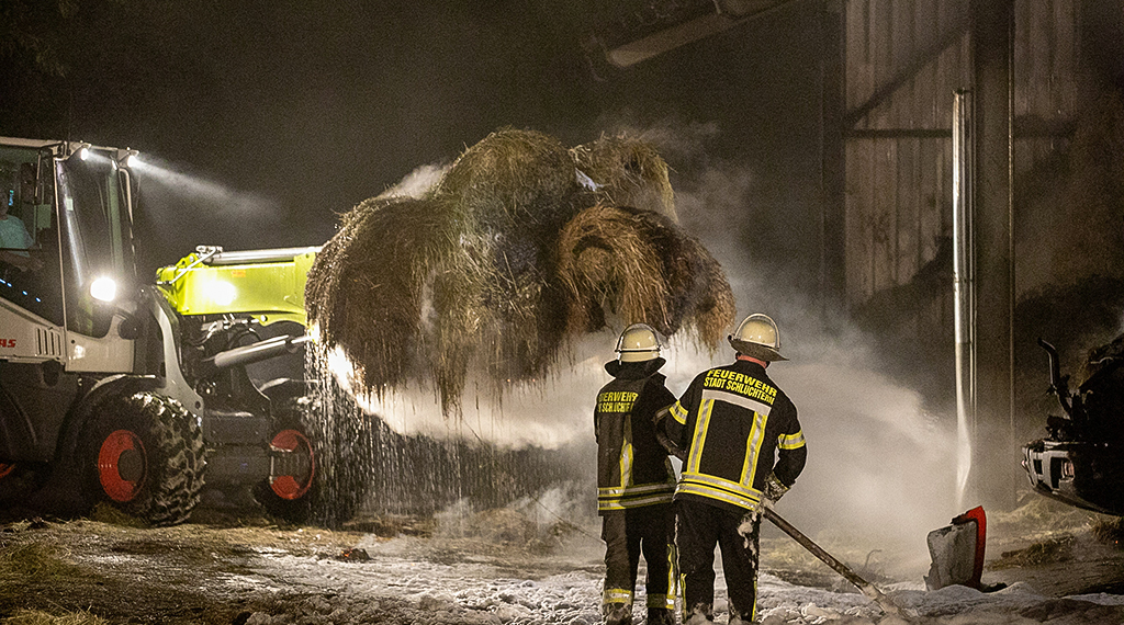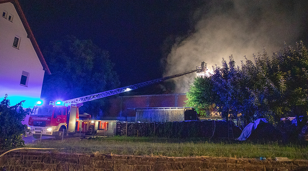 Die Scheune stand bei Eintreffen der Einsatzkräfte bereits in Vollbrand. Zahlreiche Heuballen sowie etliche landwirtschaftliche Maschinen und Fahrzeuge wurden zerstört, wie die Polizei in der Nacht mitteilte. Glücklicherweise sei es aber zu keinem Personenschaden gekommen Feuerwehr und Polizei war mit einem Großaufgebot vor Ort. Die Löscharbeiten werden sich noch bis zum Mittag hinziehen.
