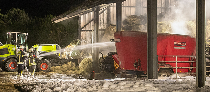 Laut Nachbarn ging der Brand wohl von dem Abgestellten Traktor aus. Als die Feuerwehr eintraf stand ein Traktor sowie ein Radlader und das Heulager in Flammen. Die Feuerwehr konnte ein übergreifen auf den Kuhstall verhindern. Laut Besitzerin sind im Stall 100 Milchkühe unter gebracht. Die Scheune wurde bei dem Feuer massiv beschädigt. In der Scheune befanden sich Maschinen und ein Heuballenlager. Die Ermittlungen zur Brandursache hat die Polizei übernommen. Der Sachschaden beläuft auf 250.000 Euro, so die ersten Schätzungen der Polizei. +++