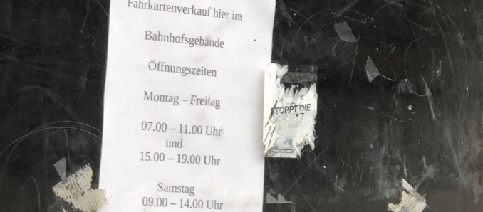 Der Bahnhof sei nach wie vor in einem erbärmlichen Zustand. Dies habe eine aktuelle Ortbesichtigung des Bahnhofs am vergangenen Sonntag erbracht. So sei die Fassade immer noch unansehnlich, das Nebengebäude eher ruinös, die Unterführung zu den Gleisen unattraktiv und verschmutzt und der Parkplatz weiterhin eine Zumutung für die Pendler und andere Nutzer. Kaum mehr nachvollziehbar sei auch, dass es bis heute seitens der Verantwortlichen nicht gelungen sei, eine Toilettenanlage am Bahnhof installieren zu lassen; zumindest die Schaffung einer vorübergehende Lösung wäre dringend erforderlich.