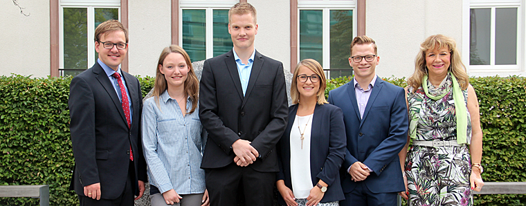 : Erster Kreisbeigeordneter Frederik Schmitt, Mareike Kutsche, Maximilian Ziegler, Gloria Kaspar, Christopher Henkel und Ausbildungsleiterin Maria Post. (v.l.)