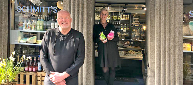 Selbstverständlich kannte Storch, der im „Goldenen Karpfen“ seine Koch-Ausbildung absolvierte und zwei Jahre den Rhöner Weikardshof betrieb, Schmitt’s Delikatessen. Als er in den regionalen Medien vom Ende des Delikatessen-Treffpunkts erfuhr und las, dass ein Nachfolger gesucht wird, musste er nicht lange nachdenken. Und mit Inhaberin Sonja von Keitz war schnell geklärt, wie es weitergehen kann: einfach so wie immer. „Was gut ist, das ändert man nicht“, bringt es Georg Storch auf den Punkt. Sonja von Keitz, die ja künftig etwas kürzertreten wird, arbeitet als leitende Angestellte weiter. „Sie bleibt ganz klar das Gesicht von Schmitt’s Delikatessen“, teilt der neue Chef erfreut mit und unterstreicht, dass Ladenlokal, Außerhaus-Angebote wie auch Online-Shop bestehen bleiben. „Ich möchte nur noch ein bisschen was drauflegen“, spricht der Wirt und Gastronom unter anderem einen Frischfisch-Verkauf an. Außerdem möchte Storch einige zusätzliche Schmankerl – aus Schoppe’s Feinkostmanufaktur – im Sortiment etablieren sowie frische Salate mit hausgemachten Dressings „to go“ anbieten.