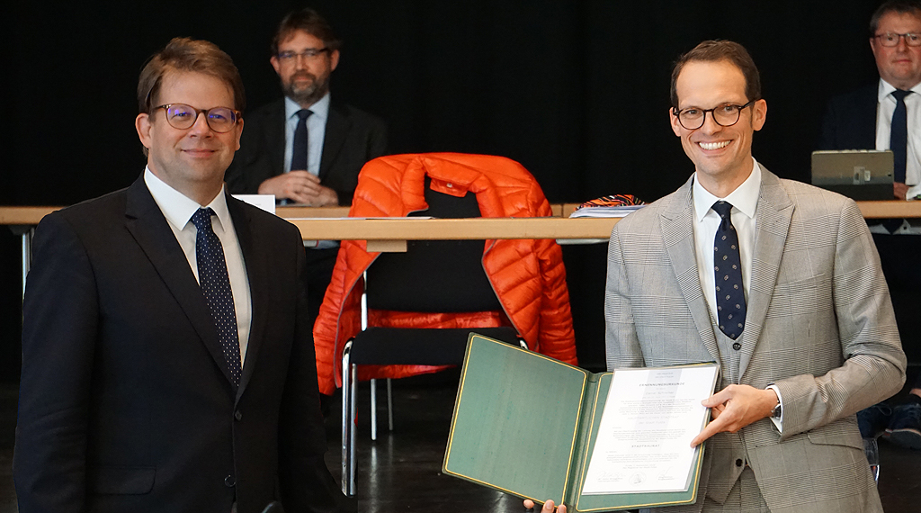 Ein weiteres Wort des Dankes galt der Stadtverordneten Ute Riebold. „Auch Ute Riebold möchte ich danken; Denn sie ist eine Vollblut-Politikerin, die auch stets an der Sache interessiert ist. Keine Eitelkeiten, keine Ideologien. Durch ihr Bestreben und mit ihren Forderungen nach transparenten Begründungen hält sie ein wichtiges, demokratisches Gut hoch. Ich freue mich, auf unsere weitere Zusammenarbeit und die Auseinandersetzung in der Sache – gerne mit einer Prise Humor.“ Gerichtet an die Mitarbeiterinnen und Mitarbeiter der Stadtverwaltung, des Abwasserverbandes und der Landesgartenschau GmbH möchte ich ebenfalls großen Dank aussprechen. Sie haben alle nach meiner Einschätzung Zutrauen in meiner und unserer Vorgehensweise gewonnen. Mir macht es Freude, zu sehen, wie ein großes Team mit viel Elan an die vielen, einzelnen Projekte geht und ich hoffe, dass wir in einigen Jahren sagen können: Das war eine ereignis- und erfolgreiche Zeit! – Verschnaufen geht daher erst nach 2026.“ Weiter dankte Stadtbaurat Daniel Schreiner dem Team seines Vorzimmers. „Mein Team leistet Unglaubliches und ohne diese, verlässliche Komponente wäre das Baudezernat nicht denkbar.“ Abschließend seiner Rede dankte Daniel Schreiner noch seiner Familie für ihre immerwährende Unterstützung und Loyalität. Neben Fuldas Oberbürgermeister Dr. Heiko Wingenfeld und der Stadtverordnetenvorsteherin, Margarete Hartmann gratulierten dem frisch gewählten Stadtbaurat auch vereinzelte Fraktionsvorsitzende, die ihm entweder für seine Wiederwahl ihre Unterstützung zusagten oder dieser nicht ablehnend gegenüberstanden.