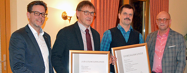 Obermeister Marco Gretsch, Firmenchef Martin Weisbeck, Jubilar Manfred Möller und der Geschäftsführer der Kreishandwerkerschaft Fulda Dr. Herbert Büttner . (v.l.)