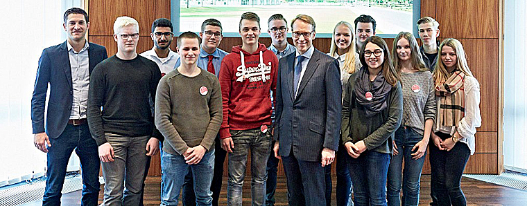 Fulda. „Weidmann trifft Schülerinnen und Schüler“ unter diesem Titel stand ein ganz besonderer Besuch beim Bundesbankpräsidenten der Klasse 13 des Wirtschaftsgymnasiums im Bildungsunternehmen Dr. Jordan. Vorab offiziell mit einem Video beworben, hatten die Schüler über ihre Bewerbung die Zusage erhalten, an dem Treffen teilnehmen zu dürfen. Insgesamt hatten sich Klassen aus ganz Deutschland um diese besondere Begegnung beworben, 13 wurden letztendlich ausgewählt – darunter auch die Fuldaer Gruppe. Gemeinsam waren die Schüler mit Lehrer Johannes Helmke (lks.) nach Frankfurt zur Deutschen Bundesbank gefahren und konnten dort dem Präsidenten Jens Weidmann ihre Fragen zu stellen und mit ihm zu diskutieren. Keine Frage, dass es um geldpolitische Themen ging, die insbesondere auch abiturrelevant sind. Im Anschluss an das zweistündige Treffen besuchten die Fuldaer Schüler noch das Geldmuseum. Fazit der Schüler: „Das war ein ganz besonderes Erlebnis, einen der wichtigsten Männer Deutschlands zu treffen.“ +++