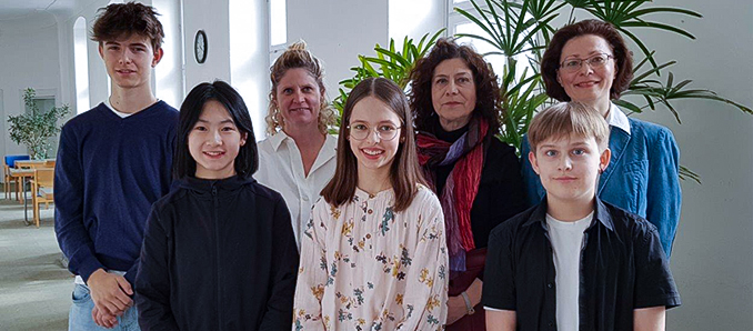 Waren in Schlitz erfolgreich (von links): Ferdinand Wehner, Ina Maoyuan Wang, Carla Schlitzer und Jonathan Ortlieb mit ihren Lehrerinnen (von rechts) Natalia Geras, Maja Zirkunow und Yvonne Roth-Wächter. Foto: Stadt Fulda.
