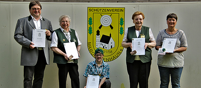 Für 25 Jahre Mitgliedschaft im Schützenverein wurde Carsten Schwerdt geehrt, er erhielt dafür die silberne Ehrennadel vom Deutschen Schützenbund. Für 30 Jahre Mitgliedschaft wurde Dominik Rech geehrt. Heike Rech wurde für 40 Jahre Mitgliedschaft ausgezeichnet und erhielt vom Deutschen Schützenbund die goldene Ehrennadel. Für 50-jährige Vereinszugehörigkeit wurde Rita Rech geehrt und bekam dafür die goldene Ehrennadel, ebenso Margreta Welle, die dem Schützenverein 60 Jahre angehört. Nach den Ehrungen konnten bei schönem Wetter und selbstgemachten Schinkenbraten ein paar schöne Stunden verbracht werden. +++ pm/ja