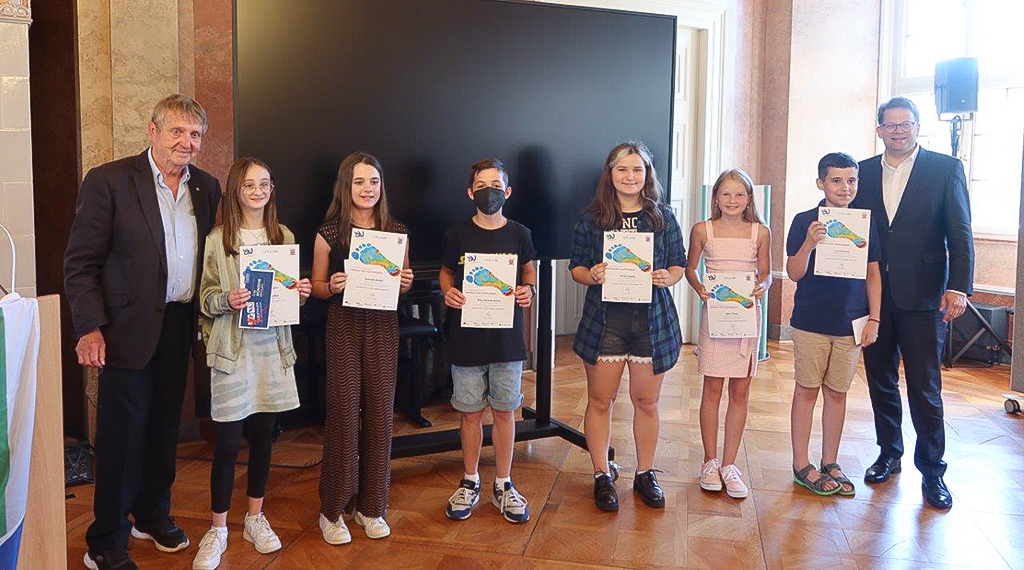 Fuldas Oberbürgermeister Dr. Heiko Wingenfeld und der Vorsitzende des Kreisverbands Fulda-Hünfeld der Euro-Union, Stephan Büttner, zeichneten insgesamt 35 Preisträgerinnen und Preisträger aus, davon erhielten vier Jungen und Mädchen Bundespreise, 11 Landespreise und 20 Anerkennungen. Teilgenommen haben folgende Schulen: Freiherr-vom-Stein-Schule (19 Preise); Rabanus-Maurus-Schule (2 Preise) und Winfriedschule (12 Preise). Zudem gab es noch Bundes- und Landespreise für das Geschwisterpaar Anna und Tilmann Sauerbier von der Keltenwall-Grundschule aus Margretenhaun, die das Thema Tierwohl künstlerisch verarbeitet hatten – inklusive einer Kuh, die auf der Weide von einem Bürstenautomaten massiert wird. Wie alle Preisträgerinnen und Preisträger erhielten sie Urkunden und Lilienthaler-Gutscheine.
