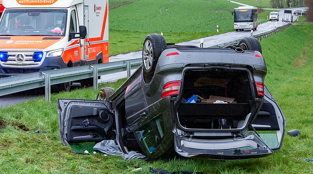 Gegen 12.27 Uhr meldete die Leitstelle des Vogelsbergkreises einen Unfall auf der L3325 zwischen Groß-Eichen und Ilsdorf mit eingeklemmten Personen. Als Ersthelfer war eine Besatzung eines Krankentransports durch Zufall vorbeigekommen. Die Kräfte befreiten die 83-jährige Beifahrerin. Der 85-jährige Fahrer, beide aus dem Hochtaunuskreis, war im Fahrzeug eingeschlossen, aber nicht eingeklemmt, er wurde durch die Feuerwehr Mücke befreit. Der 85-jährige Fahrer wurde vom Rettungsdienst ärztlich versorgt und schwer verletzt in ein Krankenhaus verbracht. Seine 83-jährige Beifahrerin wurde ebenfalls schwer verletzt mit dem Rettungshubschrauber in ein Krankenhaus verbracht. Nach bisherigen Erkenntnissen kam der Mercedes aus Richtung Groß-Eichen und wollte in Richtung Ilsdorf als er aus bisher ungeklärter Ursache nach rechts von der Fahrbahn abkam, ein Warnschild überfuhr, von der Leitplanke abgewiesen wurde, sich überschlagen hatte und auf dem Dach zum Stillstand kam. Über die Höhe des Sachschadens können derzeit noch keine Angaben gemacht werden. Im Einsatz waren 35 Kräfte der Feuerwehr Mücke, der Rettungsdienst, ein Notarzt, der Rettungshubschrauber Christoph Gießen sowie eine Streife der Alsfelder Polizei. +++ kec Mehr Blaulichtberichte auf unserer Blaulichtseite - osthessen112.