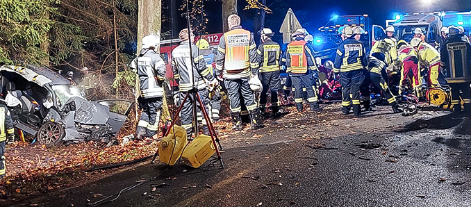 Feuerwehr und Rettungsdienst wurden am Donnerstag, 10. November 2022, um 5:22 Uhr zu einem schweren Verkehrsunfall auf der Landstraße L3179 Höhe Merneser Heiligen / Kreuzung zur L3178 alarmiert. Ein Pkw war kurz vor dem Kreuzungsbereich von der Fahrbahn abgekommen und mit starker Wucht gegen einen Baum geprallt. Der schwer verletzte Fahrer wurde dabei im Fahrzeug eingeklemmt.