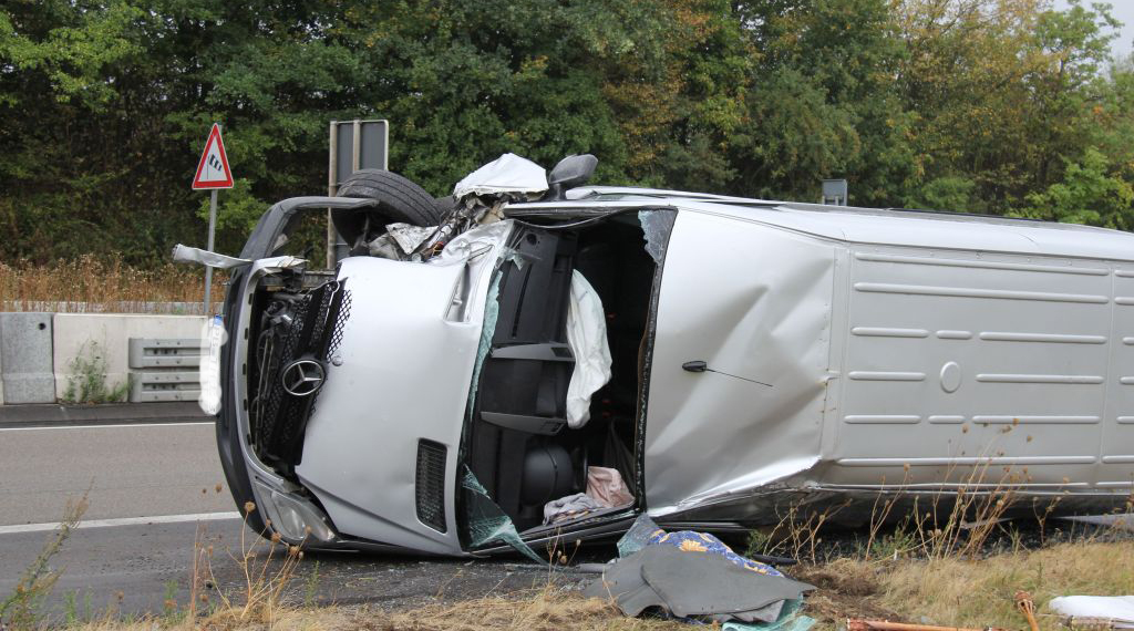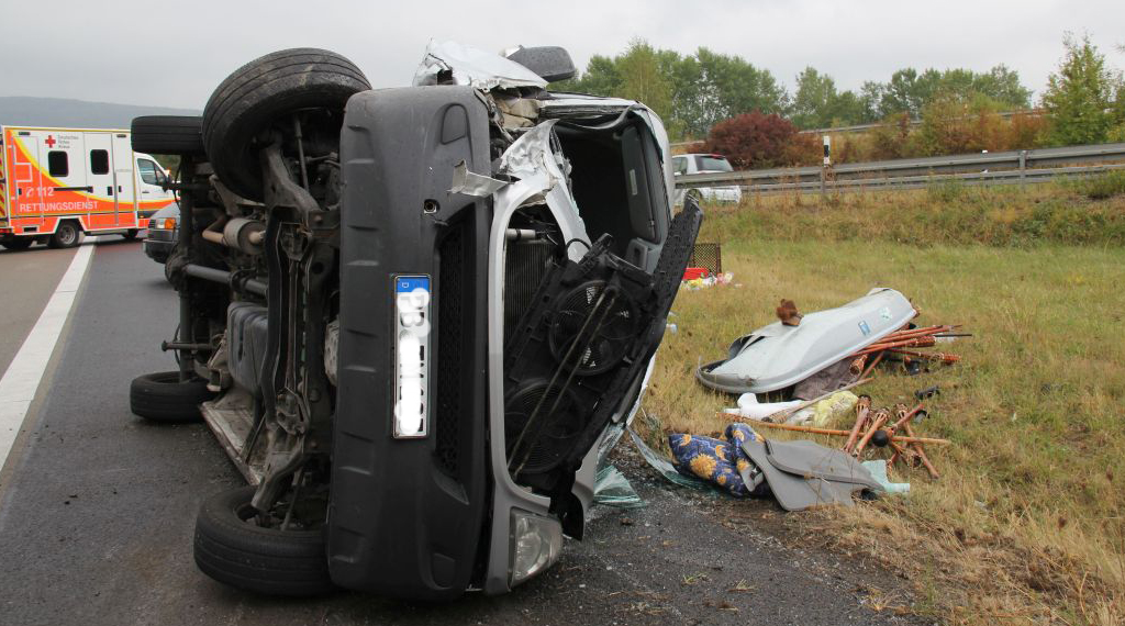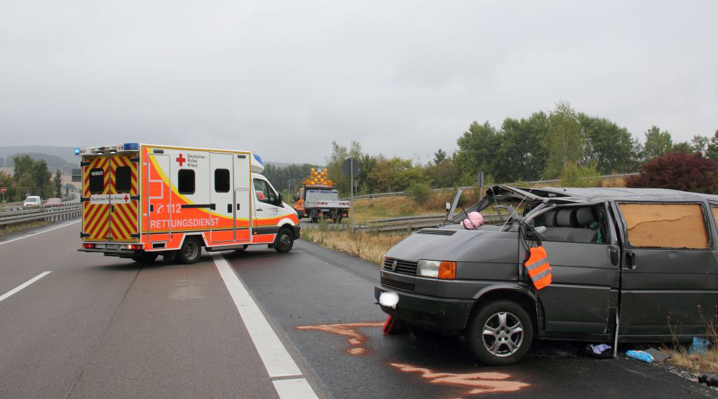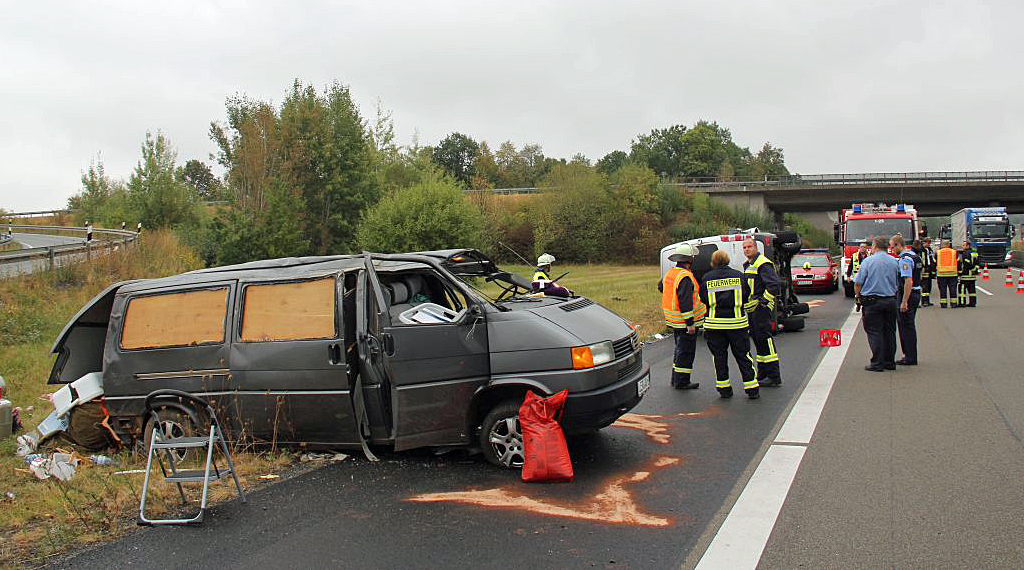 Drei Schwerverletzte und zwei völlig demolierte Fahrzeuge. Das ist die Bilanz eines Verkehrsunfalls, der sich heute gegen 13.30 Uhr auf der A7 in Höhe des Autobahndreiecks Fulda in Richtung Würzburg ereignete. Zeugenaussagen zufolge fuhren ein Pkw und ein VW-Bus die A 7 nebeneinander. Die Insassen des VW-Busses, ein Mann und seine Freundin aus Borkum, waren auf dem Weg in den Urlaub. Das Fahrzeug war voll beladen. Als der Verkehr stockte und der Fahrer des Busses seine Geschwindigkeit auf etwa 50 km/h drosseln musste, fuhr ein grauer Mercedes-Sprinter mit wesentlich höherer Geschwindigkeit gegen den Bus. Der 42 Jahre alte Fahrer des Sprinters aus Paderborn hatte die abbremsenden Fahrzeuge offensichtlich zu spät bemerkt. Der VW-Bus überschlug sich nach dem Anstoß mehrfach und kam schließlich wieder auf den Rädern zum Stehen. Der Kleintransporter stürzte um und lag auf der Seite. Alle drei Fahrzeuginsassen wurden verletzt. Sie wurdem in umliegende Krankenhäuser verbracht. Die polizeilichen Ermittlungen dauern an. Zum Zeitpunkt der Berichterstattung standen die Personalien der Insassen des Busses noch nicht fest. An beiden Fahrzeugen entstand wirtschaftlicher Totalschaden. Die A 7 musste zunächst voll gesperrt und der Verkehr auf die A66 abgeleitet werden. Erst zwei Stunden später konnten die Absperrmaßnahmen aufgehoben werden. +++