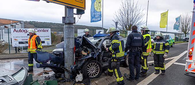 Der Mann war auf der Strecke von Landenhausen in Richtung Großenlüder unterwegs, als sein Fahrzeug aus noch ungeklärter Ursache die Kontrolle verlor und mit voller Wucht gegen den Mast prallte. An diesem waren auch Verkehrshinweisschilder angebracht. Der Aufprall war so heftig, dass das Fahrzeug massiv beschädigt wurde. Trümmerteile des Pkw verteilten sich über die gesamte Kreuzung.