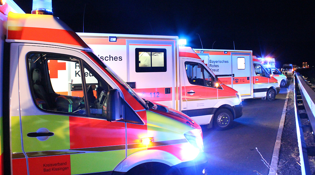 Die Feuerwehr Bad Brückenau wurde am Freitagabend zu einem schweren Verkehrsunfall auf die A7 alarmiert. Auf Höhe Sinntalbrücke Fulda in Richtung Würzburg wurde ein Verkehrsunfall mit 2 Pkw`s gemeldet. Aufgrund eines Auffahrunfalls, verursacht durch einen Kleintransporter, schleuderte ein BMW mit fünf Insassen, welche auf der Heimreise von einem Konzert waren, über ca. 150 Meter mehrfach gegen die Leitplanke und kam erst am Ende der Sinntalbrücke zum Stehen. Nach Erkundung der Lage, hat die Feuerwehr die Erstversorgung der insgesamt fünf verletzten Personen, übernommen und mehrere Rettungswagen nach alarmiert. Der Kleintransporter des Unfallverursachers war nicht mehr fahrbereit und wurde vor Ort von seinen hinzugerufenen Kollegen umgeladen. Der Fahrer stand unter Schock und wurde vom Rettungsdienst betreut. Ein dritter beteiligter Kleintransporter hatte nur leichte Schäden, der Fahrer blieb unverletzt. Nach zirka eineinhalb Stunden war der Einsatz für die Feuerwehr beendet. Die Polizei und Autobahnmeisterei haben die weiteren Absicherungsmaßnahmen übernommen. Aufgrund von Aufräumarbeiten kam es noch mehrere Stunden zu Verkehrsbeeinträchtigungen. +++ pm