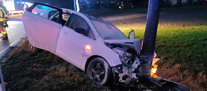Zu einem schweren Unfall kam es am Dienstagmorgen gegen 6.40 Uhr zwischen Kämmerzell und Gläserzell. Dort fuhr ein Auto gegen einen Baum. Nach ersten Erkenntnissen verlor die 24-jährige Fahrerin aus dem Vogelsbergkreis die Kontrolle über ihr Fahrzeug und prallte zunächst rechts gegen die Leitplanke und dann frontal gegen einen links neben der Straße stehenden Baum. Das Auto fing Feuer, Ersthelfer löschten sofort mit Feuerlöschern. Das Auto wurde dabei im Frontbereich stark beschädigt. Die Frau, die sich alleine im Fahrzeug befand, kam verletzt in ein Krankenhaus. Im Einsatz waren die Feuerwehren Fulda und Kämmerzell mit insgesamt zwölf Personen, Rettungsdienst und Polizei. +++ [su_112]