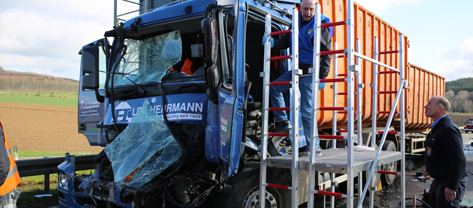 Grünberg. Zu einem schweren Verkehrsunfall kam es am Mittwochvormittag auf der A5 in Richtung Frankfurt nahe Grünberg. Insgesamt drei Lastwagen krachten ineinander, dabei wurde ein Fahrer schwer verletzt im seinem Fahrzeug eingeklemmt. Er wurde von der Freiwilligen Feuerwehr der Gemeinde Mücke aus seinem Unfallwrack gerettet.