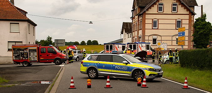 Am Sonntagmittag kam es gegen 13:30 Uhr zu einem schweren Verkehrsunfall auf der Bundesstraße 276 in Höhe der Seenbrücke in Grünberg. Zwei Fahrzeuge kollidierten im Kreuzungsbereich, vier Personen wurden dabei verletzt.