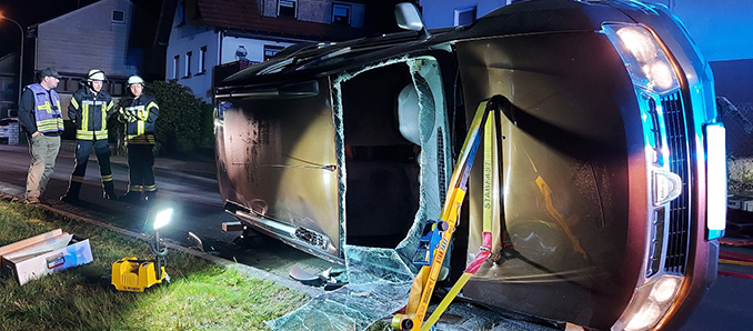 Das Fahrzeug lag auf der Seite, der Fahrer war aber ansprechbar und nicht eingeklemmt. In Absprache mit dem Rettungsdienst und Notarzt wurde eine schonende Rettung über die Frontscheibe, die zersägt wurde, durchgeführt. Der Patient wurde dem Rettungsdienst übergeben und kam zur Untersuchung in ein Krankenhaus. Die Feuerwehr kümmerte sich noch um die verunreinigte Straße und das Unfallfahrzeug.
