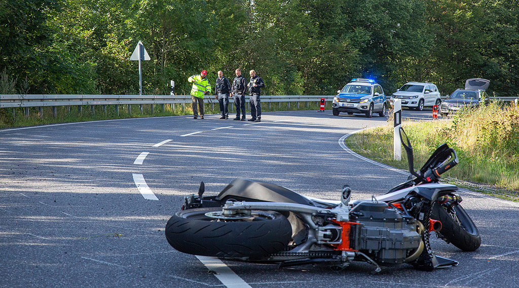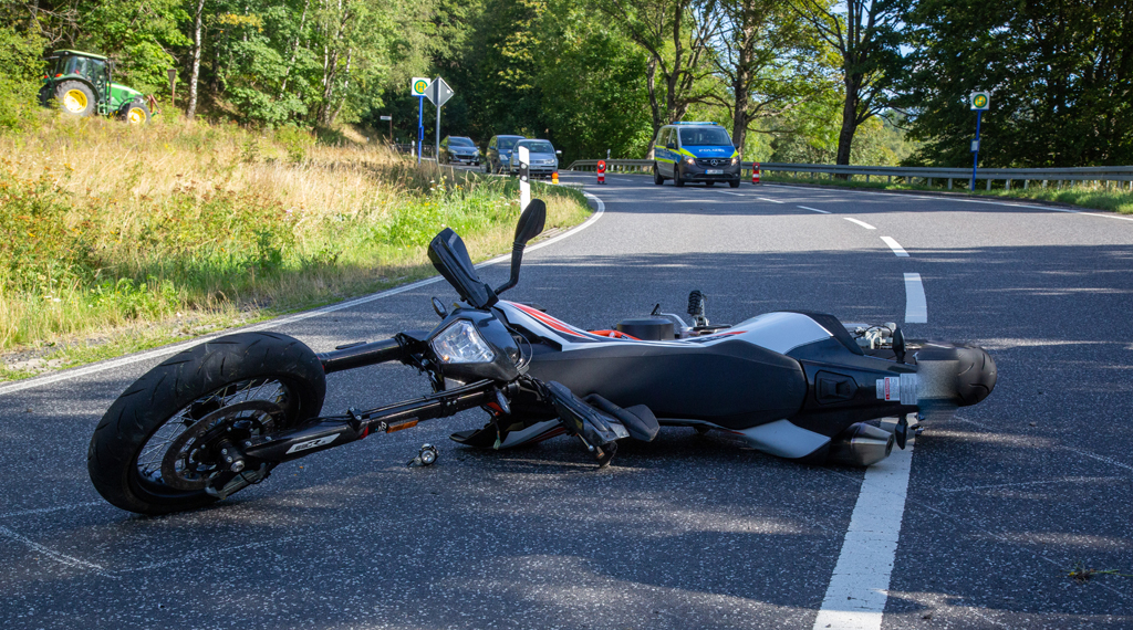 Zu einem schweren Verkehrsunfall kam es am Sonntagmorgen gegen 9.10 Uhr auf der B458 in Höhe des Grabenhöfchens in der Gemeinde Poppenhausen. Ein 22-jähriger Motorradfahrer aus der Gemeinde Ebersburg befuhr die Bundesstraße von Dipperz in Richtung Hilders. In einer Kurve kam der junge Mann von der Fahrbahn ab und krachte in die Leitplanke. Dadurch erlitt der Kradfahrer lebensgefährliche Verletzungen im Kopf-, Hals- und Wirbelsäulenbereich und musste mittels RTW und Notarzt in ein Fuldaer Krankenhaus verbracht werden. Am Kraftrad entstand Totalschaden in einer Höhe von ca. 8000 Euro. Zur Ermittlung der Unfallursache wurde durch die Staatsanwaltschaft Fulda ein Gutachten in Auftrag gegeben. Wegen der Abschleppung des Krades, Unfallaufnahme und Begutachtung des oben angegebene Straßenabschnitt war dieser bis 11:30 Uhr voll gesperrt. +++