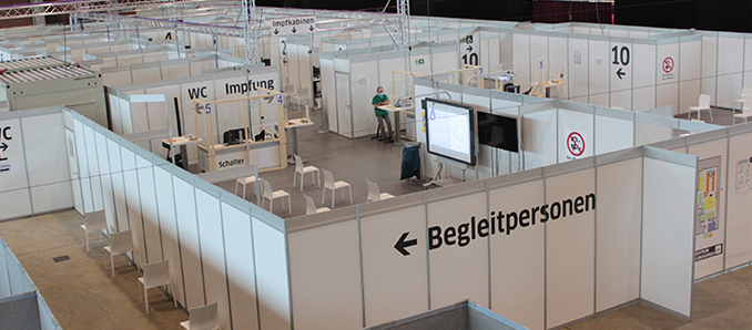 November 2021: Ähnlich der Infektionszahlen zieht die Nachfrage in Wellen an. So auch im November 2021: Die „Impfsprechstunden“ werden in die Künstlerkabinen in der Hessenhalle verlegt. Etwa 150 bis 200 Impfungen werden dort unter der Woche täglich durchgeführt.