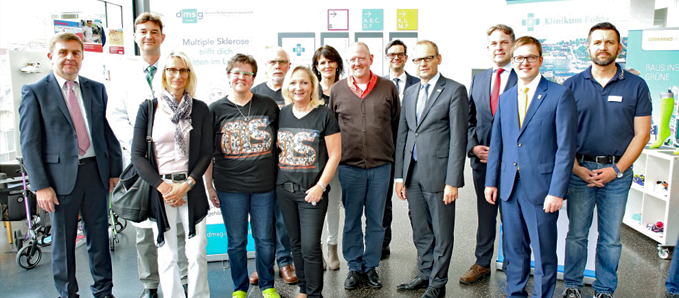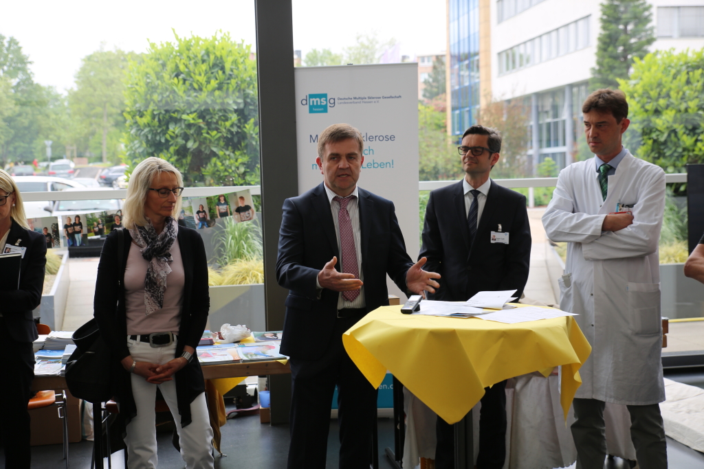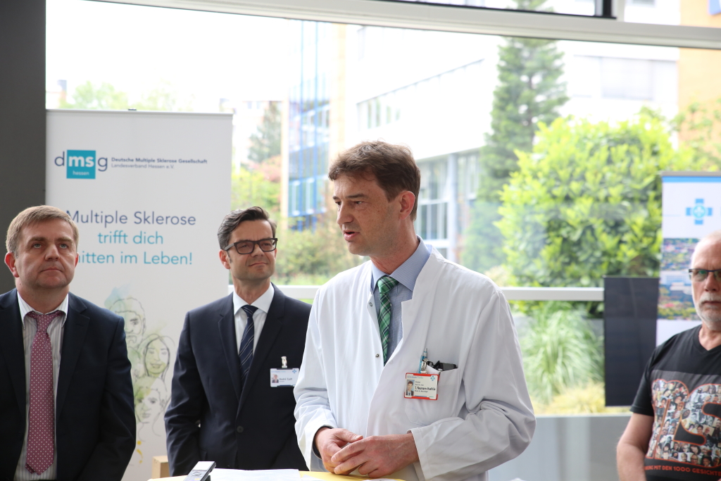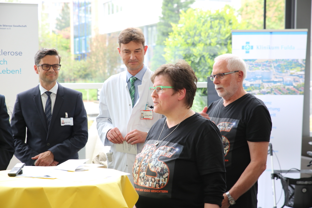 Das Motto des diesjährigen Multiple-Sklerose-Tages: „Selbstbestimmt Leben mit MS“ – und dies mit einer eindeutigen Botschaft: „Aufmerksamkeit schaffen – für eine nicht seltene Erkrankung.“ Neben Info-Ständen in der Eingangshalle, rundeten Vorträge zur Multiple Sklerose, gehalten von Fachexperten, das Rahmenprogramm im Krankenhaus der Maximalversorgung ab. Als Referent und Moderator fungierte Prof. Dr. Tobias Neumann-Haefelin, Direktor der Klinik für Neurologie am Klinikum Fulda. Weitere Gesprächspartner waren u. a. André Eydt, Vorstand der Administratiom am Klinikum, Fuldas Bürgermeister Dag Wehner (CDU), Frederik Schmitt (CDU), Erster Kreisbeigeordneter des Landkreises Fulda sowie Bernd Crusius, Geschäftsführer der DMSG-Hessen.