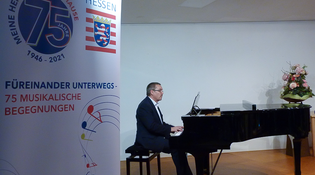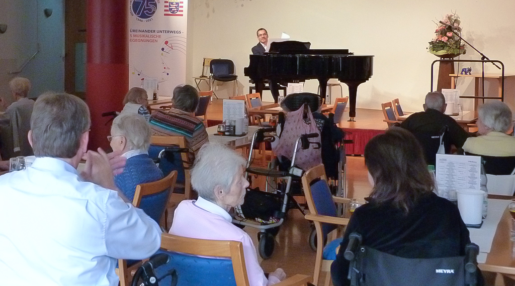 Pianist Jürgen Steffenhagen spielte virtuos am Klavier und interpretierte unter anderem Klassiker der Filmmusik, lud zum Mitsingen ein und dankte für den Applaus nach jedem einzelnen Stück. Derartigen Zuspruch nach jedem Titel kannte Steffenhagen von seinen bisherigen Auftritten so nicht, fand aber sichtlich Gefallen an dieser besonderen Quittierung seines Schaffens. Erklärungen und kleine Anekdoten begleiteten seine Stücke „Raindrops keep falling on my head“ aus dem Western „Butch Cassidy and the Sundance Kid“, „Wonderful World“ von Louis Armstrong oder „Man müsste Klavier spielen können“, bei manchem der Lied sang das Publikum gerne mit. Das Konzert fand in der Gaalbernstube des Hauses statt, viele Bewohner nahmen die Möglichkeit dieses Konzertes wahr. Die Begrüßung zu diesem Konzert-Event erfolgte durch Marc Baumann, Leiter Soziale Betreuung. Er drückte seine große Freude darüber aus, dass die Mediana Seniorenresidenz als Gastgeber für eines der 75 Konzerte zum Jubiläum des Landes Hessen ausgewählt wurde.