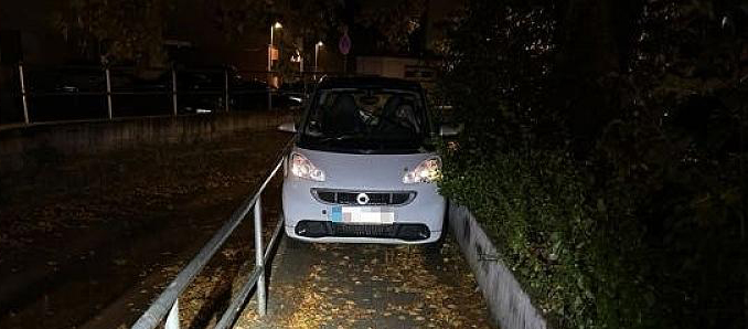 Der festgefahrene Smart auf dem Gehweg in Dreieich. Foto: Polizeipräsidium Südosthessen