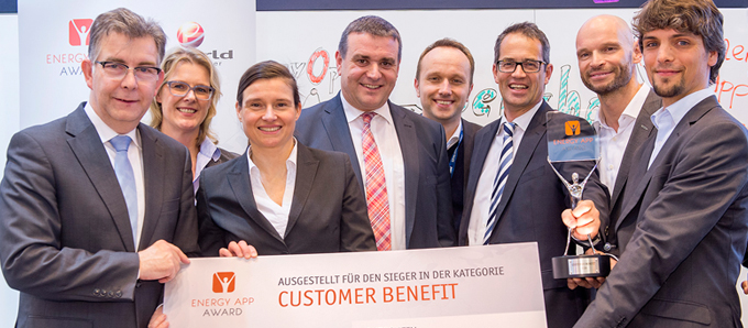 Martin Heun (ganz links, Sprecher der Geschäftsführung der RhönEnergie Fulda), nahm im Beisein der Jurymitglieder und Vertreter der Thüga sowie ihrer Mitglieds-Unternehmen (v. l.) Stefanie Hamm, Cordelia Müller, Jörg Höhler, Sebastian Syren, Dr. Gerhard Holtmeier, Dr. Roman Dudenhausen und Dr. Christoph Ullmer den „Energy App Award“ für die Smart Home-Lösung „daheim“ entgegen. Foto: E-world energy & water