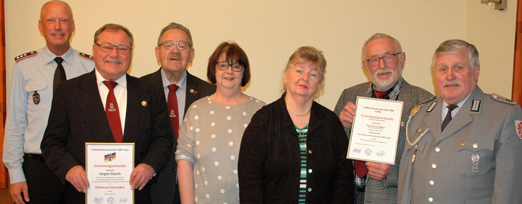 Neuer Vorstand der Soldatenkameradschaft 1888 Fulda (von links): 1. Vorsitzender Günter Wolf, Ehrenvorsitzender Jürgen Storch, 2. Vorsitzender Martin Schäfer, Schriftführerin Katarina Roder, Kassiererin Ursula Wirthmann, Fahnenträger Paul Gustav Klüber, Außenbeauftragter Karl Joseph Magnus Bohl.