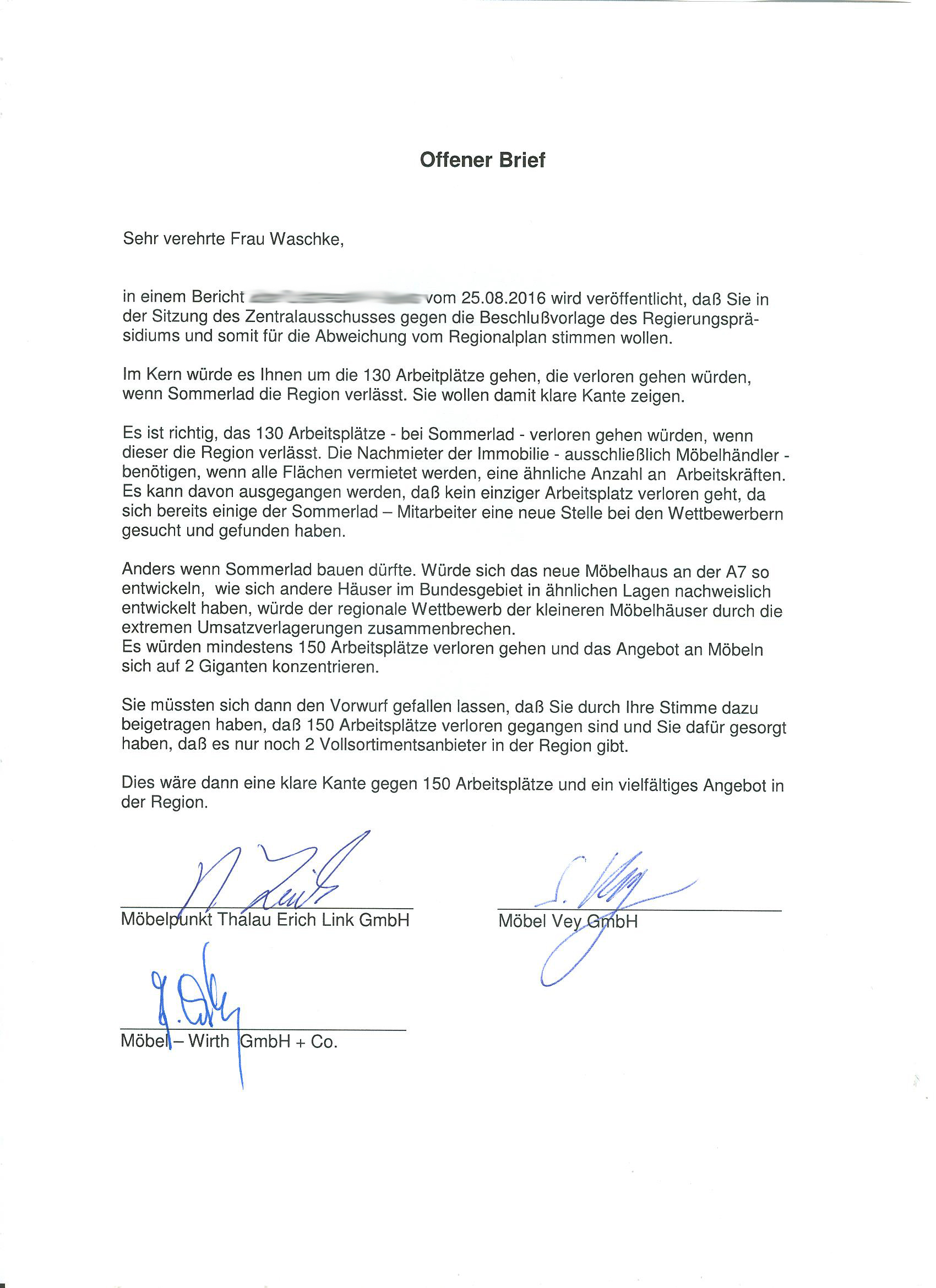 Jedenfalls hat die gute Frau Waschke jetzt mal die Fakten schwarz auf weiß. Der Brief von den Möbelhäusern der Region bringt es sachlich auf den Punkt.