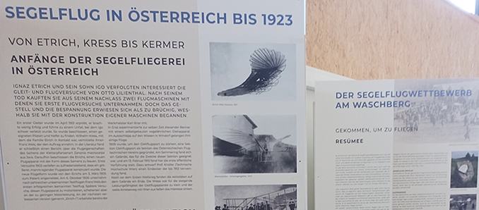 An elf Stellwänden wird das Zeitgeschehen dargestellt, wird aufgezeigt in welchem Umfeld sich der Segelflug 1923 entwickeln musste, es sei nur die Inflation genannt. Natürlich wird der Bezug zur Wasserkuppe und den ersten Rhönwettbewerben ebenso erzählt, wie die Zeit nach diesem Start des Segelfluges in Österreich. Die Sonderausstellung mit den Infotafeln, dem Flugmodell der Wien und einer Vitrine, in der die ersten Konstruktionen der damaligen Zeit als Pappmodelle zu sehen sind, findet sich in der Grosse-Halle des Deutschen Segelflugmuseums mit Modellflug. Sie wird bis in den Herbst zu sehen sein, ein Besuch des Museums lohnt sich. +++ pm