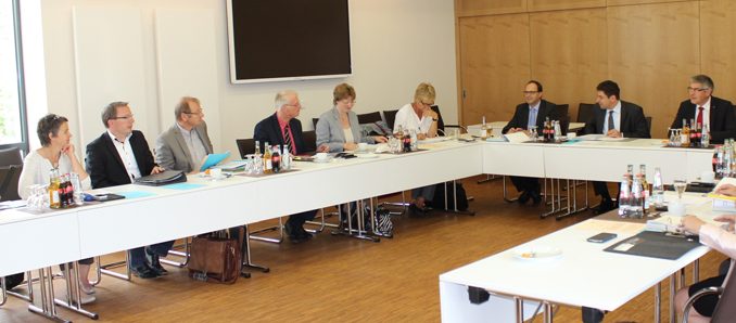Lauterbach. Vogelsberg-Landrat Manfred Görig begrüßte gemeinsam mit Dr. Jan Hilligardt, Direktor des Hessischen Landkreistages, die Mitglieder des Sozialausschusses des Spitzenverbandes der 21 Landkreise im Lauterbacher Kreishaus. Beratungen und Positionierungen zu aktuellen sozialpolitischen Themen, insbesondere aus den Bereichen Jugendhilfe und Eingliederungshilfe für behinderte Menschen waren wichtige Themen. Im Mittelpunkt standen die Beratungen und der Austausch zum hochaktuellen Thema der Aufnahme und Unterbringung von Flüchtlingen.