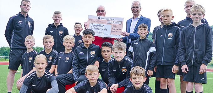 Einen besonderen Akzent setzte die Sparkasse dieses Mal beim Jugendfußball. Mittlerweile ist ein flächendeckendes Angebot fast überall nur dann noch möglich, wenn benachbarte Vereine kooperieren. Die Sparkasse unterstützte deshalb 30 Jugendfördervereine und -spielgemeinschaften im Landkreis mit insgesamt 20.000 Euro. Der Sparkassenchef brachte den symbolischen Scheck zum Training der D-Junioren der JSG Rhön auf dem Sportplatz in Hilders mit. Dort begrüßten ihn Kreisjugendwart Fredde Wess, Ehrenamtsbeauftragter Rudi Klemenz und JSG-Trainer Carsten Sauer.