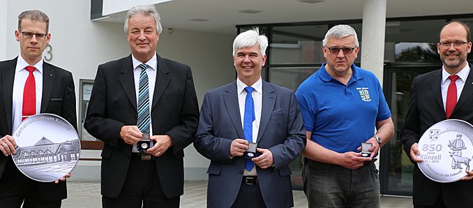 Fulda/Künzell. Die Gemeinde Künzell feiert dieses Jahr ihr 850-jähriges Bestehen. Aus diesem Anlass hat die Sparkasse Fulda hat im Rahmen der Jubiläumsaktivitäten eine Medaille aufgelegt und diese heute im Beisein von Peter Meinecke, Bürgermeister von Künzell, im Rathaus, offiziell präsentiert. Die ersten Medaillen wurden bei der Präsentation vom stellvertretenden Vorstandsvorsitzenden der Sparkasse Fulda, Uwe Marohn, an die Gemeindevertretung überreicht. Die Silbermedaillen, von der passend zum Jubiläum exakt 850 Stück angefertigt wurden, können ab Montag in den Sparkassenfilialen Künzell und Bachrain für 49 Euro das Stück erworben werden. Ein Goldmedaille gibt es auf Anfrage. +++ fuldainfo | jessica auth