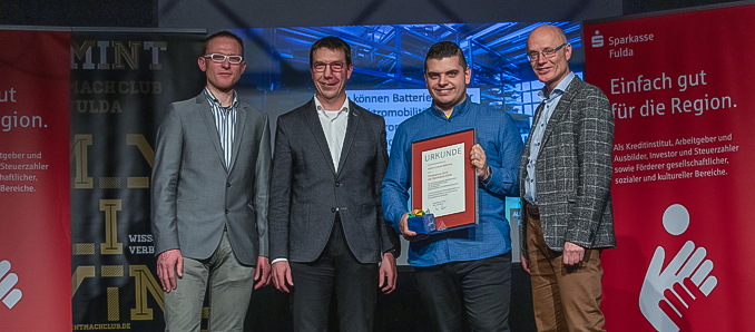 Freut sich über die Auszeichnung seiner Abschlussarbeit: Lukas Böhning, Bachelorabsolvent des Fachbereichs Elektrotechnik und Informationstechnik der Hochschule Fulda. Prof. Dr. Ulf Schwalbe, der die Arbeit betreute, Vizepräsident Prof. Dr. Steven Lambeck und Richard Hartwig, Vorstandsreferent der Sparkasse Fulda, (v..l.) gratulierten. Foto: Uli Mayer