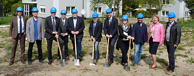 Unterstützung allenthalben: Den Spatenstich für ein wegweisendes Konzept führten (von links) Architekt Dominique Tzschoppe, stellvertretender Leiter VLR Roland Bamberger, Verwaltungsdirektor Dr. Christof Erdmann, die Vorstandsmitglieder der Eichhof-Stiftung Lauterbach Volker Christe, Hans-Jürgen Schäfer und Manfred Dickert, Vize-Landrat Dr. Jens Mischak, Julia Drews und Tobias Rübbert (VLR), die Vorsitzende des Fördervereins Psychiatrie Vogelsberg e.V. Dr. Britta von Molo und 1. Stadtrat Lothar Pietsch durch.
