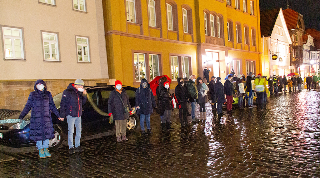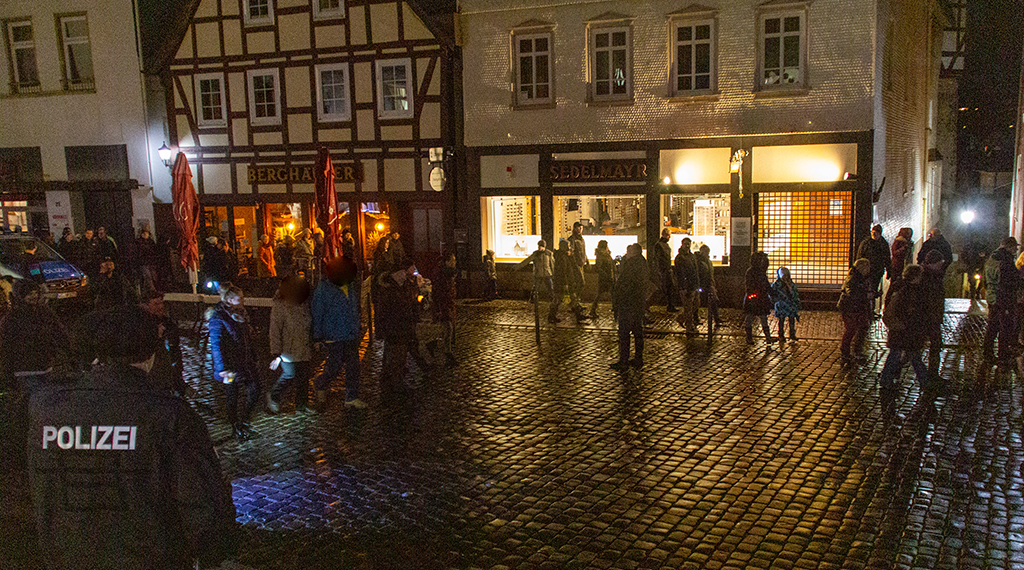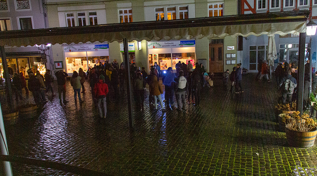 Es war ein Bündnis aus CDU, SPD und den Grünen. Man hatte eine „Licht-aus-Aktion“ gestartet, die von vielen Geschäftsleuten, dem Stadtmarketing und der Kirche mitgetragen wurde. So blieben der Hohhaus-Garten, die Stadtkirche und die Beleuchtung im Baum vor der Kirche komplett dunkel. Alles in allem sind beide Demos friedlich verlaufen. +++ ec