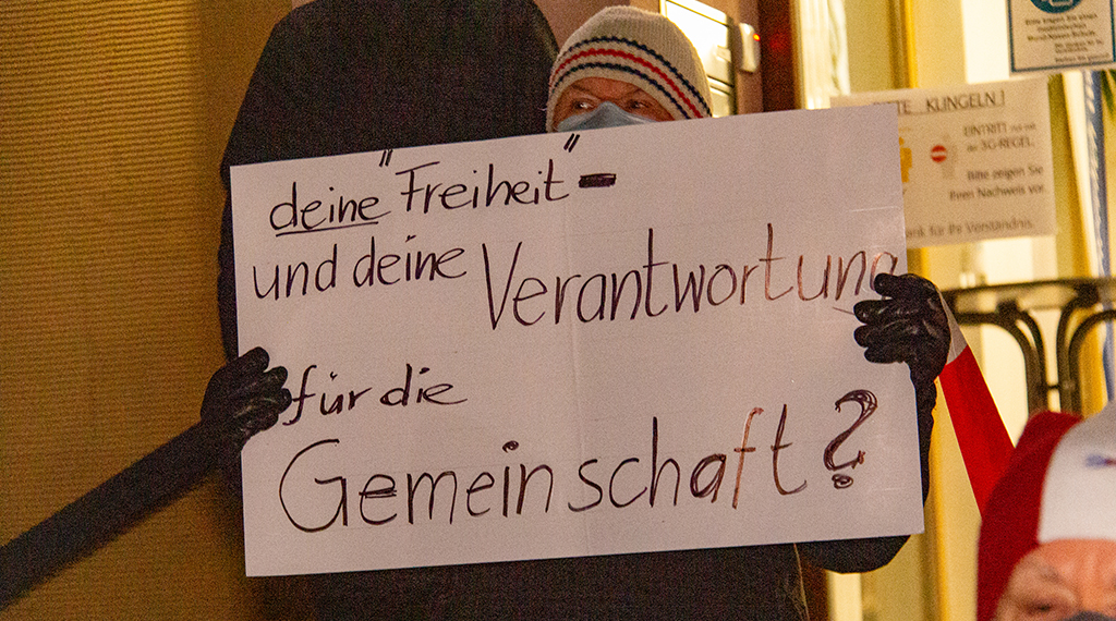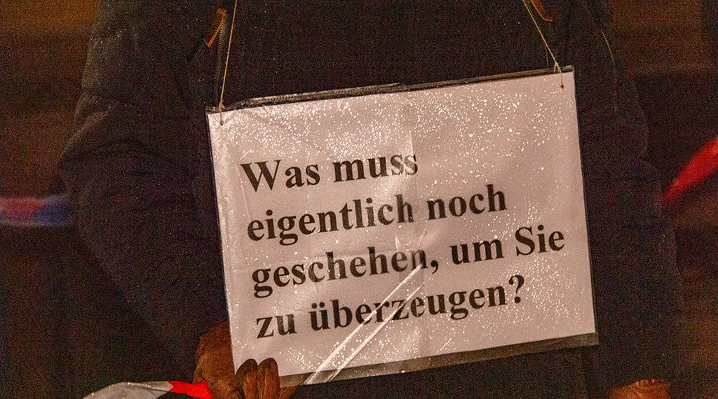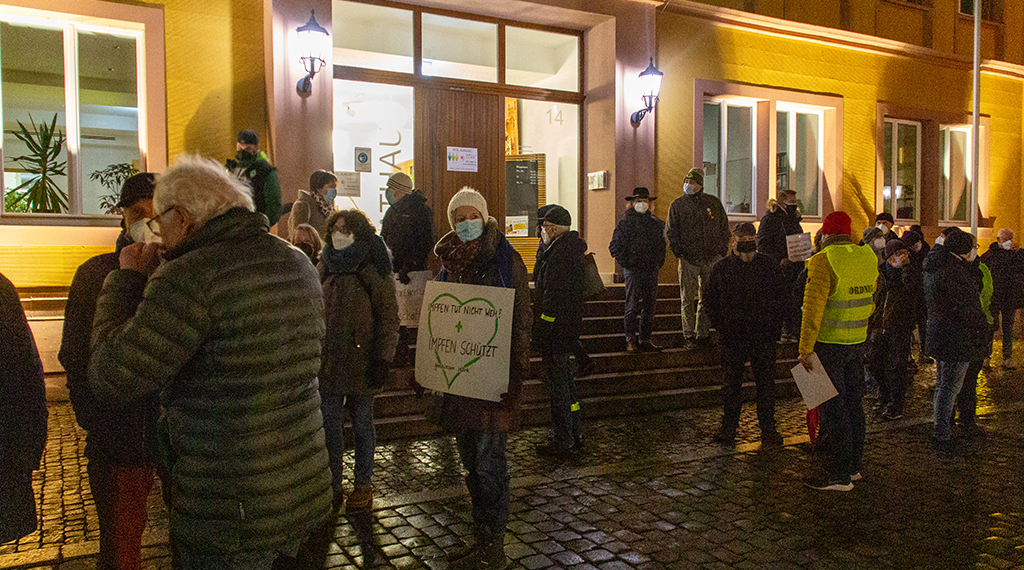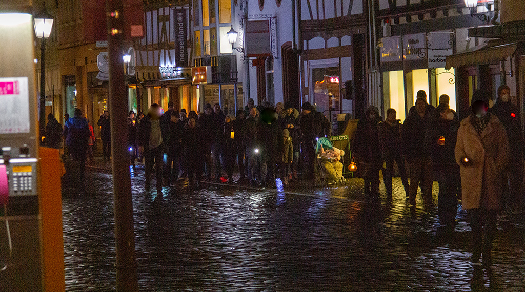 Bei nasskaltem Wetter versammelte sich eine angemeldete Gegendemo mit rund 100 Teilnehmern vor dem Rathaus. Auch die „Spaziergänger“ waren in der Spitze mit rund 170 Teilnehmern vertreten; natürlich wieder nicht angemeldet. Einen Ansprechpartner gab es auch nicht.