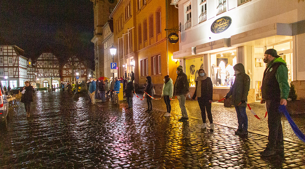 Harald Korsten (Bündnis 90/Die Grünen) sagt uns: „Ich bin überrascht, dass doch soviele gekommen sind, obwohl das Wetter nicht so günstig ist. Es ist doch eine tolle Resonanz, dass die Lauterbacher Bürger Präsens und Haltung gezeigt haben. Es ist in dieser Pandemiezeit notwendig, dass wir durch die Menschenkette den gesellschaftlichen Zusammenhalt symbolisieren.“ Man habe sich nicht provozieren lassen und es kam auch keine Provokation, betont Korsten. „Es ist ja ein Aktionsbündnis. Wir werten Aktion für Aktion aus und werden uns beratschlagen. Es ist gar nicht gesagt, ob wir nächsten Montag eine Aktion machen. Wir wollen unberechenbar bleiben, um hier Zusammenrottungen mit ‚Spaziergängern‘ zu vermeiden, die nicht so friedlich sind, wie heute Abend“, so Harald Korsten.