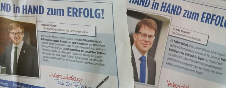 Fulda. Das unverblümte Unterstützen der heimischen Zeitung durch Fuldas Oberbürgermeister Wingenfeld und Vize-Landrat Schmitt, könnte eigentlich in der Rubrik „Peinlichkeiten“ vermerkt werden. Allerdings handelt es sich hierbei nicht um irgendwelche Privatpersonen, sondern um die Führungskräfte der Stadt- bzw. Kreisverwaltung. Diese aber haben die Pflicht, Medien gleichberechtigt zu behandeln und keine öffentlichen Präferenzen zu äußern, kritisieren die SPD-Unterbezirksvorsitzende Sabine Waschke und der Co-Vorsitzender des SPD-Stadtverbandes Fulda, H.-J. Tritschler.