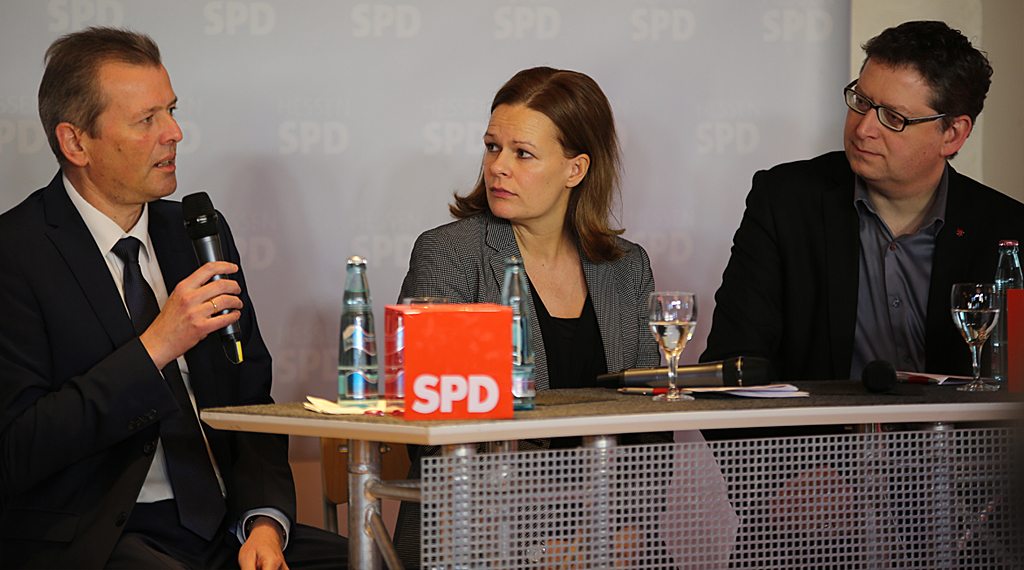 Im Anschluss folgte eine Diskussionsrunde mit Thorsten Schäfer- Gümbel, Vorsitzender der hessischen SPD und Fraktionsvorsitzender im Hessischen Landtag, Dr. Ulrich Maly sowie Nancy Faeser. +++ fuldainfo | jessica auth