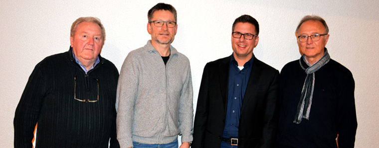 Rudi Geißler, Ortsvereinsvorsitzender Andreas Fey, der Vogelsberger SPD Vorsitzende und designierte Landtagskandidat Swen Bastian und Kirtorfs SPD-Fraktionsvorsitzender Heinrich Raab nach der Delegiertenwahl in der Gleentalhalle.
