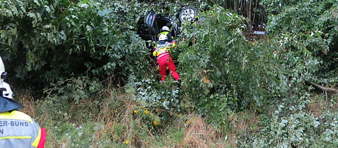 Kassel. Spektakulär verlief ein Unfall auf der A44 am heutigen frühen Nachmittag. Gegen 13.07 Uhr gingen starke Regenfälle nieder. Ein 55-jähriger Pkw-Fahrer aus Vollmarshausen kam vermutlich aufgrund nicht angepasster Geschwindigkeit in Schleudern und prallte mit seinem Fahrzeug auf ein vorausfahrendes Gespann, welches aus einem Pkw mit Segelfluganhänger bestand. Dieses wurde von einem 62-jährigen aus Bottrop gelenkt. Der 55-jährige kam nach dem Aufprall nach rechts von der Fahrbahn ab, überschlug sich an der Böschung und blieb in ca. 4 Meter Höhe im Geäst eines Baumes kopfüber hängen. Er musste aus dieser Lage durch die Kasseler Berufsfeuerwehr befreit werden. Nach ersten Erkenntnissen erlitt er Prellungen und wurde zur Beobachtung in eine Krankenhaus eingeliefert. Sein Pkw wurde von dem Kranwagen der Feuerwehr aus dem Baum geborgen. Der Gespannfahrer blieb unverletzt. Sein Gespann kam ebenfalls ins Schleudern, rutschte in den Flutgraben und kam entgegengesetzt zur Fahrbahn zum stehen. Insgesamt entstand ein Sachschaden in Höhe von ca. 50.000 Euro. Die Fahrbahn in Richtung Dortmund musste für ca. anderthalb Stunden gesperrt werden. +++ fuldainfo | bilder: ppnh