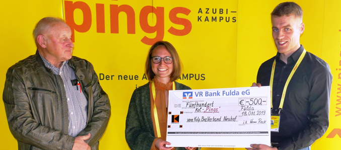 Bei einer unlängst stattgefundenen Besichtigung der neuen Jugendeinrichtung in der Liobastraße durch Mitglieder der Kolpingfamilien des Bezirkes Neuhof, ergriff Werner Reck, als Bezirksvorsitzender (links) die Gelegenheit der Leitung von „pings“ Michael Igelmann (rechts) und Sabrina Weß (Bildmitte) eine Start-Spende über 500,-- Euro zur Umsetzung des einzigartigen Konzeptes zu überreichen.