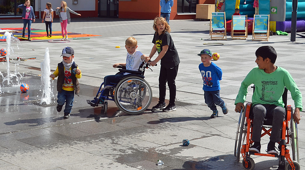 Vor allem Kinder nutzten die vielfältigen Angebote wie z.B. einmal auszuprobieren, wie es sich anfühlt im Rollstuhl zu sitzen oder einen „Rollstuhlführerschein“ zu machen. Daneben erprobten sie ihre Fertigkeiten am Klettermast der Jugendfeuerwehr, tobten auf der Hüpfburg, nahmen am Kinderschminken teil oder testeten ihre Fähigkeiten bei verschiedenen Ballspielen, am Spielteppich und beim Tischtennis. Auch „sport grenzenlos“-Gründer und Organisator Holger Nikelis, der seit einem Badeunfall selbst im Rollstuhl sitzt, freute sich über die rege Teilnahme. Gewisse Vorurteile und Bedenken sollten durch gemeinsames Aktivsein abgebaut werden.