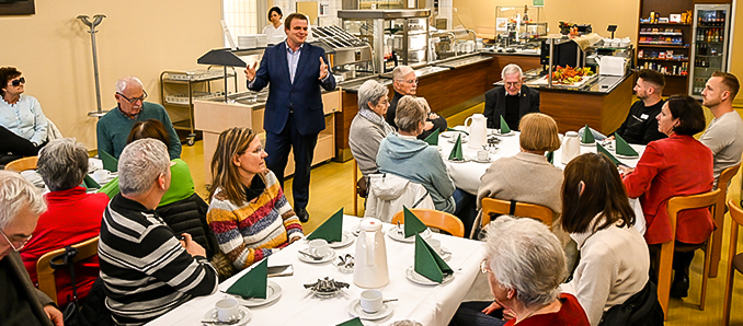 Auch Hünfelds Bürgermeister Benjamin Tschesnok wandte sich an die Besucherinnen und Besucher. Unter den Gästen befand sich unter anderem Brunhilde Wehner, Pflegedienstleiterin, Oberin des Hünfelder Konvents und spätere Generalobere der Barmherzigen Schwestern des Heiligen Vinzenz von Paul in Fulda. Tschesnok knüpfte an die Predigt Schmidpeters an und betonte, dass die Gesellschaft immer älter werde. Gerade vor diesem Hintergrund komme der Helios Klinik in Hünfeld eine große Bedeutung für Menschen aller Altersgruppen zu – weit über die Stadtgrenzen hinaus. Besonders wichtig sei, so der Bürgermeister, dass das Krankenhaus im Landkreis Fulda auch aufgrund der Notfallversorgung als systemrelevant einzustufen sei. Er dankte dem Helios Konzern für dessen Entscheidung, den Standort weiter zu stärken und für die Zukunft auszubauen.
