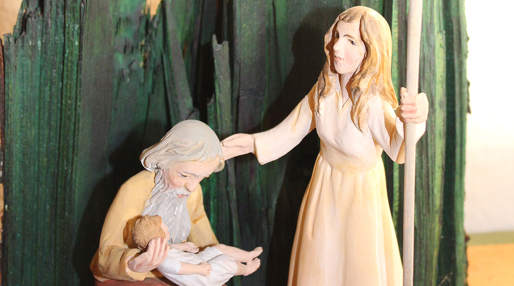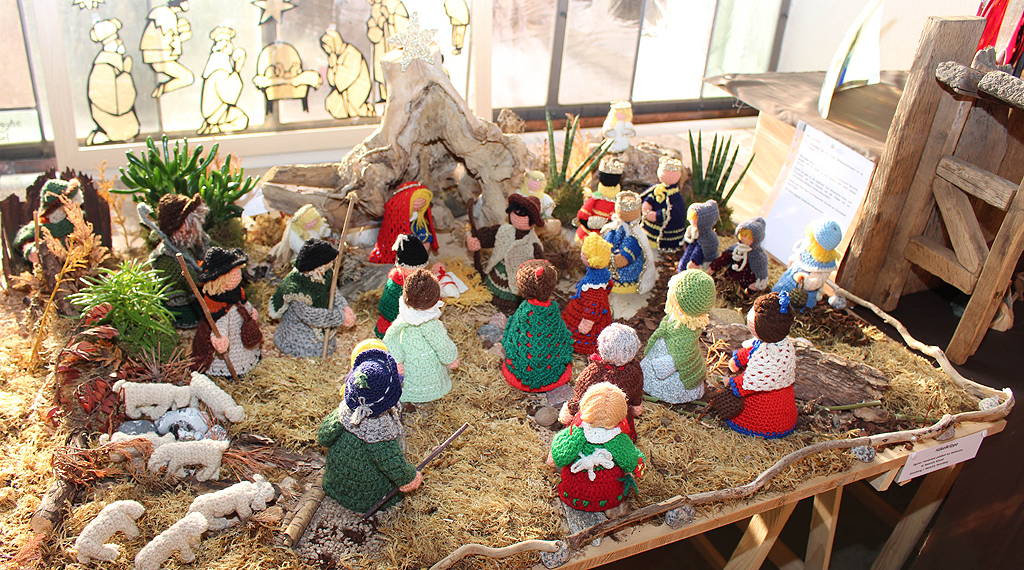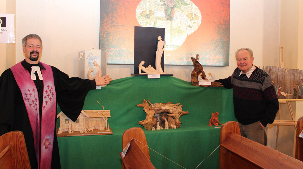 Neben klassischen Krippendarstellungen könnten auch moderne und außergewöhnliche Exponate besichtigt werden. Eine modern gestaltete Krippe von Dieter Robert Frank, einem Bildhauer aus der thüringischen Rhön, zeigt Josef, der auf einem Strohballen sitzt und das Kind im Arm hält. Neben ihm steht Maria mit einem überdimensionalen Hirtenstab in der Hand. Der Bildhauer aus Thüringen hat es Jochen Weinrich angetan. Von ihm stammt auch eine abstrakte Darstellung von Maria, Josef und dem Christuskind aus Lindenholz. „Man kann die Bewegung spüren, die in der Darstellung steckt,“ schwärmt der Krippensammler.
