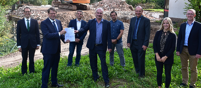 Bei der offiziellen Übergabe des Förderbescheids an der Baustelle an der Rittlehnstraße hoben Oberbürgermeister Dr. Heiko Wingenfeld und Stadtbaurat Daniel Schreiner das vielfältige Engagement der Caritas im sozialen Wohnungsbau hervor. „Für uns als Stadt ist die Caritas dabei ein Partner, der für langjährige Zusammenarbeit und hohe Verlässlichkeit steht“, sagte Wingenfeld. Für den Standort Maberzell spreche zum einen die enge Verbindung der Caritas zum Ort, wo sie ja schon seit vielen Jahrzehnten mit verschiedenen Einrichtungen vertreten ist, sowie die hohe Wohnqualität in Maberzell: „Der Stadtteil bietet von Kindergarten und Grundschule über Wohngebiete und Busanbindung bis hin zur Nahversorgung die ganze Bandbreite an kommunaler Infrastruktur – und dies inmitten der Natur mit Nähe zum Schulzenberg“, betonte der OB.