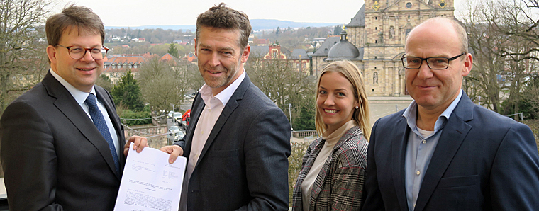 „Förderbescheid GWH“ (von links): Oberbürgermeister Dr. Heiko Wingenfeld, GWH Bauprojekte-Geschäftsführer Christian Wedler, Sophie Hillenbrand (Bauordnungsamt Stadt Fulda) und Jürgen Fehl (Leiter Bauordnungsamt Stadt Fulda). Foto: Stadt Fulda