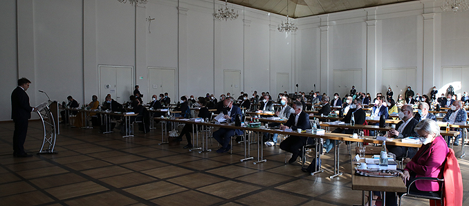Der Oberbürgermeister der Stadt Fulda, Dr. Heiko Wingenfeld (CDU), hieß die alten und neuen Stadtverordneten im Stadtsaal herzlich willkommen und gratulierte ihnen zu ihrer (Wieder-)Wahl und ihr erworbenes Mandat. Daneben dankte er ihnen, dass sie „in wahrhaft schwieriger Zeit dazu bereit sind, Verantwortung für unsere Stadt Fulda zu übernehmen.“ „Die Konstituierung der Stadtverordnetenversammlung am heutigen Tag wird auch in der historischen Betrachtung bedeutsam sein“, sagte er. In den vergangenen Jahrzehnten habe es keinerlei vergleichbare Situationen mit vergleichbaren Rahmenbedingungen gegeben. Der Einsatz, so Oberbürgermeister Wingenfeld weiter, für die Gesundheitsversorgung, die Bildung, die Wirtschaft, die Innenstadt, den Klimaschutz und die finanzielle Nachhaltigkeit werde die Stadtverordneten fordern und dies unter „zweifelsohne schwierigen finanziellen Rahmenbedingungen in den kommenden Jahren.“
