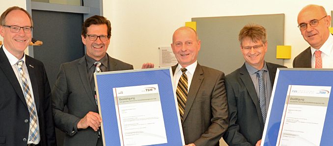 Hünfeld. Die Kunden der Stadtwerke Hünfeld können sowohl bei Gas, Wasser, als auch bei Strom darauf vertrauen, dass bei der Versorgung alle einschlägigen technischen Regelwerke, Gesetze und organisatorischen Vorkehrungen eingehalten werden, damit eine ohe Versorgungsqualität und Sicherheit gewährleistet werden kann. Die Stadtwerke Hünfeld haben dies nun auch schriftlich: Dipl.-Ing. Heinz Flick, Geschäftsführer des Deutschen Vereins des Gas- und Wasserfaches, Landesgruppe Hessen, überreichte Bürgermeister Stefan Schwenk als Aufsichtsratsvorsitzendem sowie den Geschäftsführern Gerhard Biensack und Stefan Schubert sowie dem Abteilungsleiter Technik, Horst Höfer, die Urkunden für das technische Sicherheitsmanagement nach bestandener Zertifizierung.