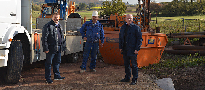 Gemeinsam mit dem Technischen Geschäftsführer der Stadtwerke, Gerhard Biensack, informierte er sich vor Ort beim Brunnenmeister Rudi Hahn über den Fortschritt der Arbeiten. In der vergangenen Woche war die Bohrung bereits bis zu 35 Meter in den Boden getrieben worden, Ziel ist es, 200 Meter zu erreichen. In dem kluftigen Buntsandstein-Untergrund werden Trinkwasservorkommen vermutet, die durch den Bau eines Brunnens erschlossen werden könnten.
